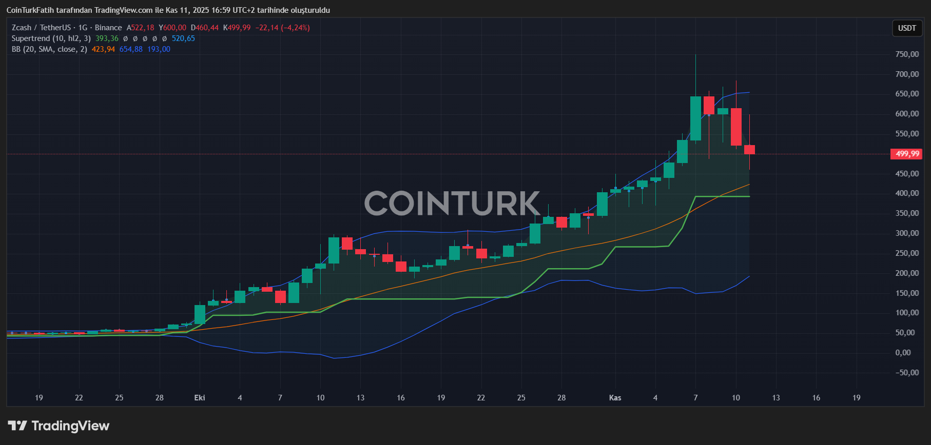在750美元关口反复震荡后,ZEC始终未能站稳650美元上方。当前需重点关注460-380美元支撑区间的反应。若比特币市场持续疲软,价格或下探至313美元低位。