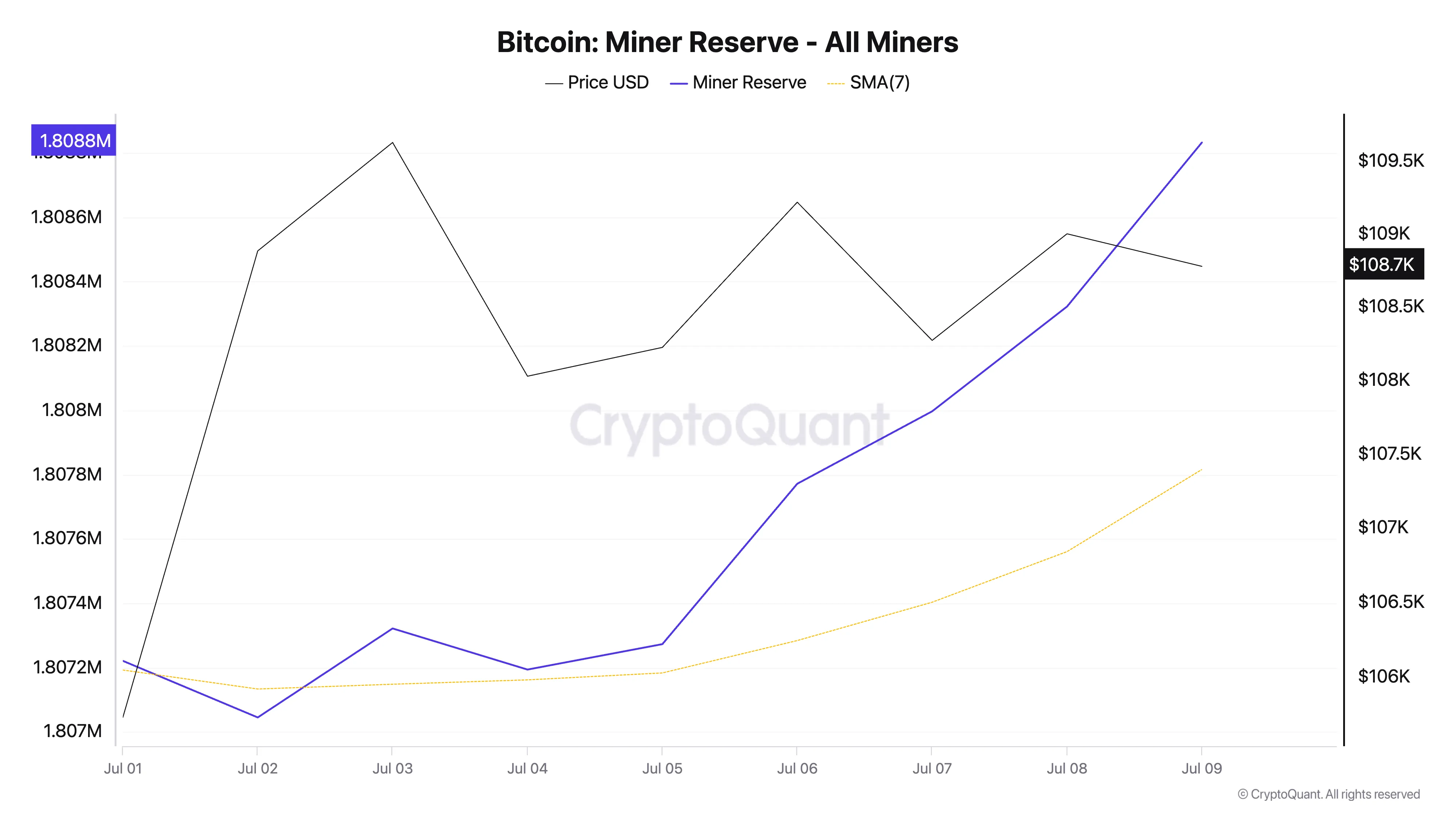 7月以来矿工储备的增长表明,随着市场上涨压力加大,矿工行为正从抛售转向持币待涨。