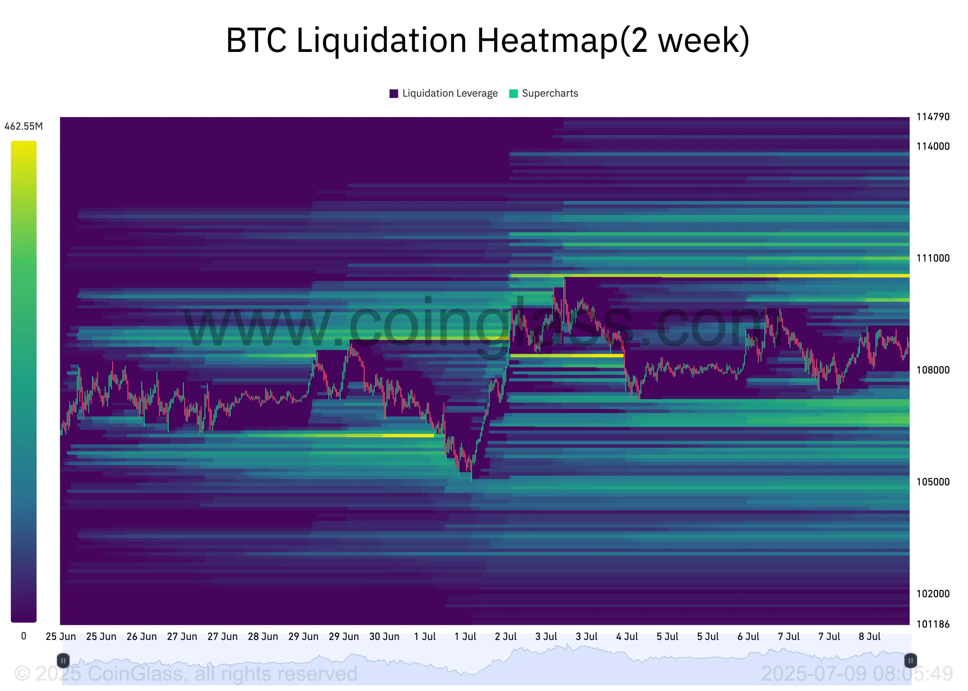 BTC清算热力图显示,110,473美元价格区间存在显著的流动性聚集。