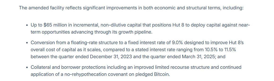 根据官方声明,修订后的协议将原有6500万美元信贷额度提升至1.3亿美元。该交易为Hut 8提供了非稀释性资本以支持其发展计划。