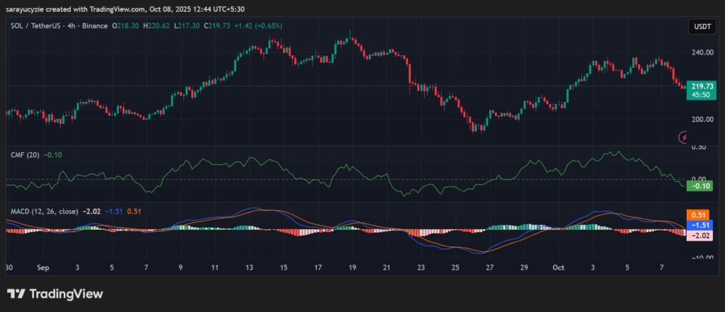 Solana的MACD指标线位于零轴下方,但信号线仍处零轴之上,显示多空动量交织。整体趋势偏空,短期动能仍在整固阶段。此外,Chaikin资金流量指标(CMF)报-0.10,表明市场存在适度抛压。目前资金持续外流,除非买盘动能增强,否则SOL可能继续承压。