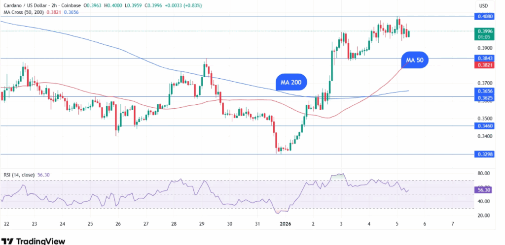 卡尔达诺(ADA)在其2小时图表上出现了金叉形态,即50周期移动均线上穿200周期均线。这一技术信号通常预示看涨趋势正在加强。该形态形成于ADA从1月1日0.331美元的低点反弹之后,反映出2026年初加密货币市场的整体上涨动能。