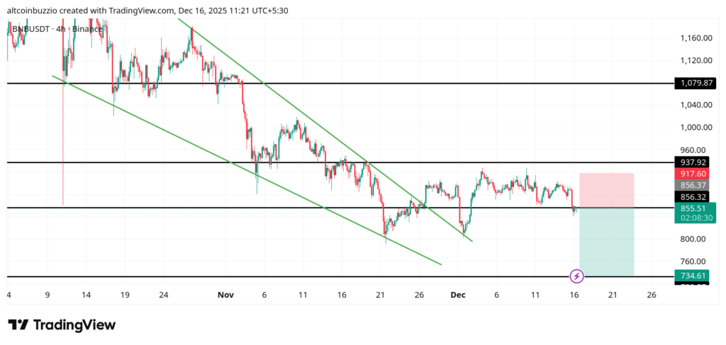 BNB在下降的均线下方,于856.3美元附近维持着一个脆弱的基础。压缩形态预示着即将面临方向性考验,937.9美元和734.6美元是关键的风险界定位。