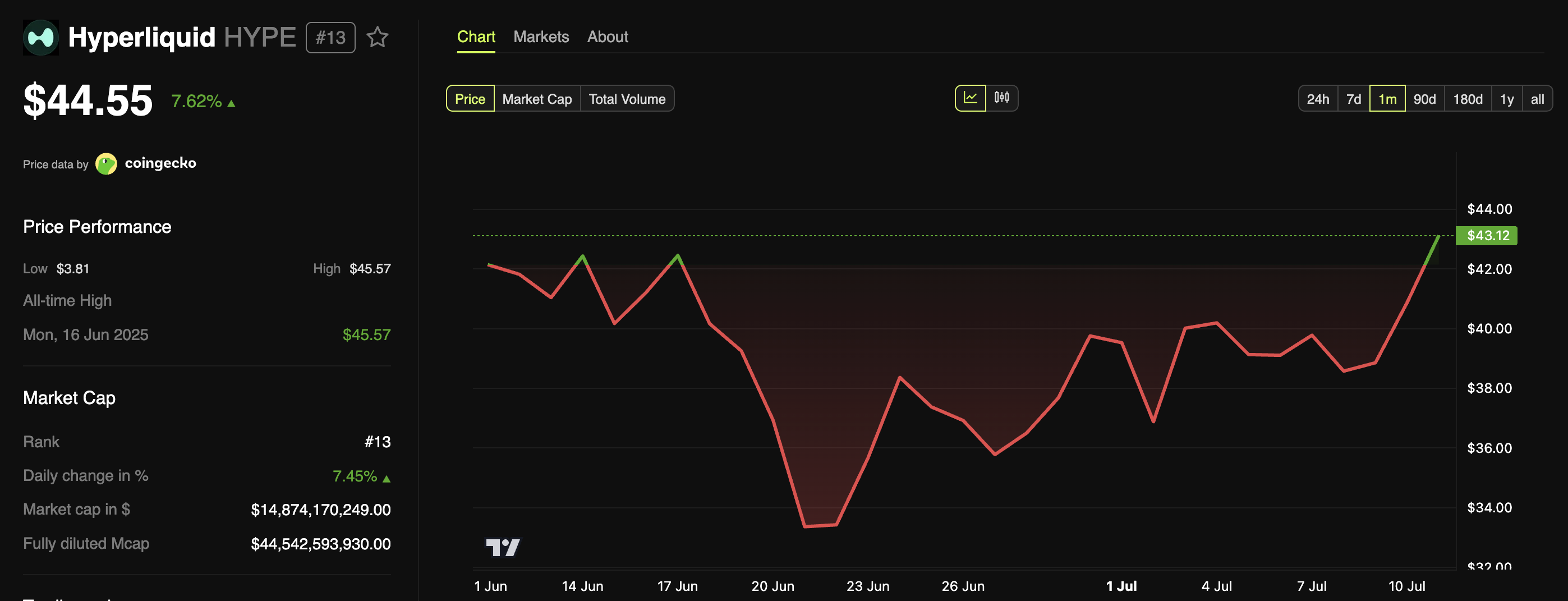 数据显示,HYPE在6月16日创历史新高后虽经历短暂回调,但很快收复大部分失地。本周以来更连续攀升,最新24小时涨幅达7.62%,当前报价44.55美元
