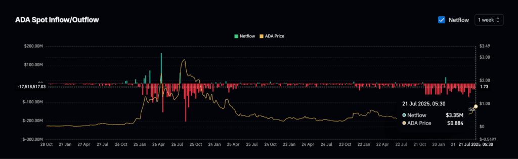 首项预警来自ADA现货交易所净流入数据。在持续数周的资金外流(通常视为看涨信号,表明长期持有者将资产转移至冷钱包)后,7月21日出现335万美元的小幅回流。虽然金额不大,但在价格大幅波动后代币重返交易所,往往预示持有者可能准备抛售。