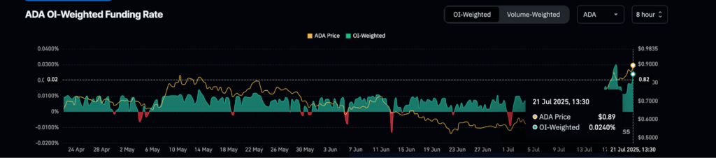 衍生品市场呈现过热迹象。7月21日ADA持仓量加权资金费率达0.024%,创四月以来次高。这种飙升表明多数交易者正在做多并愿意支付额外费用维持头寸,意味着杠杆率上升。