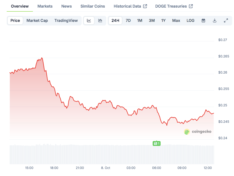 截至发稿时,据CoinGecko数据显示,狗狗币交易价格为0.2478美元,24小时交易量为37.6亿美元。价格在过去24小时下跌4.85%,但过去一周上涨3.17%。
