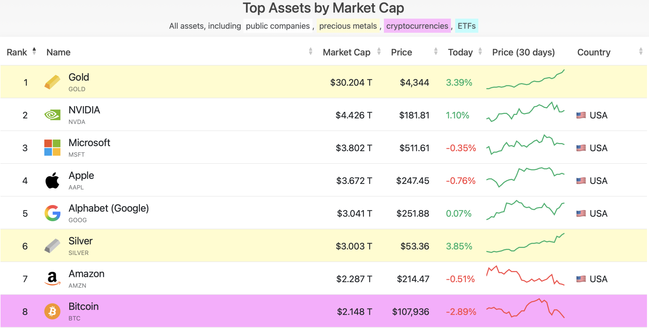 根据最新全球企业市值排名,黄金正式进入未知领域,成为历史上首个突破30万亿美元市值的资产。这一里程碑事件巩固了黄金作为全球最具价值财富存储工具的地位,其表现超越了全球所有主要企业和数字资产。