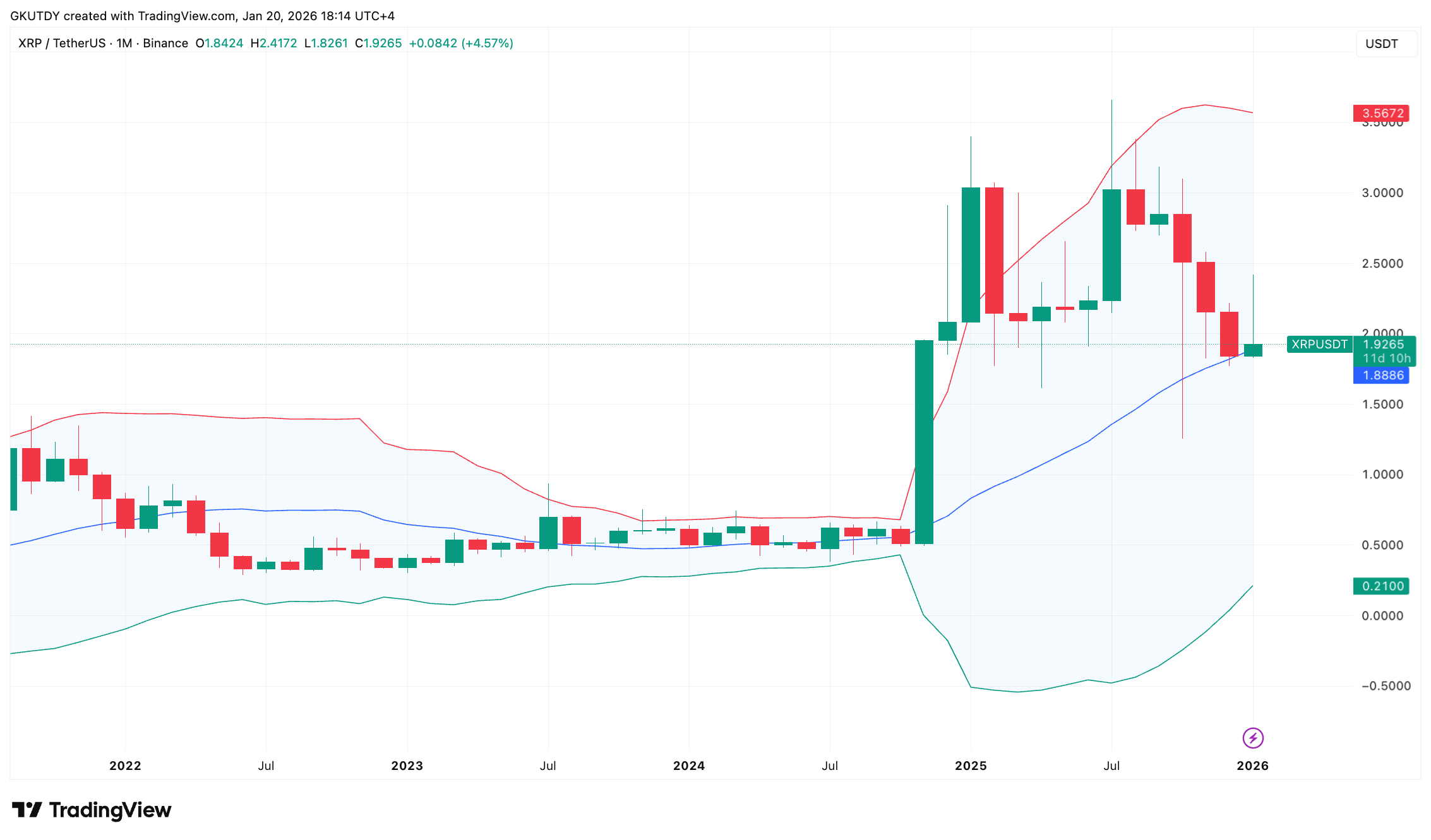 失守中轨不仅意味着回调——它将使2024年11月以来所有突破看涨策略失效。当该中轨在2020年跌破时,XRP价格进入了长达两年的熊市盘整。如今的不同在于幅度:下轨已下移至0.20美元,而非0.60美元。