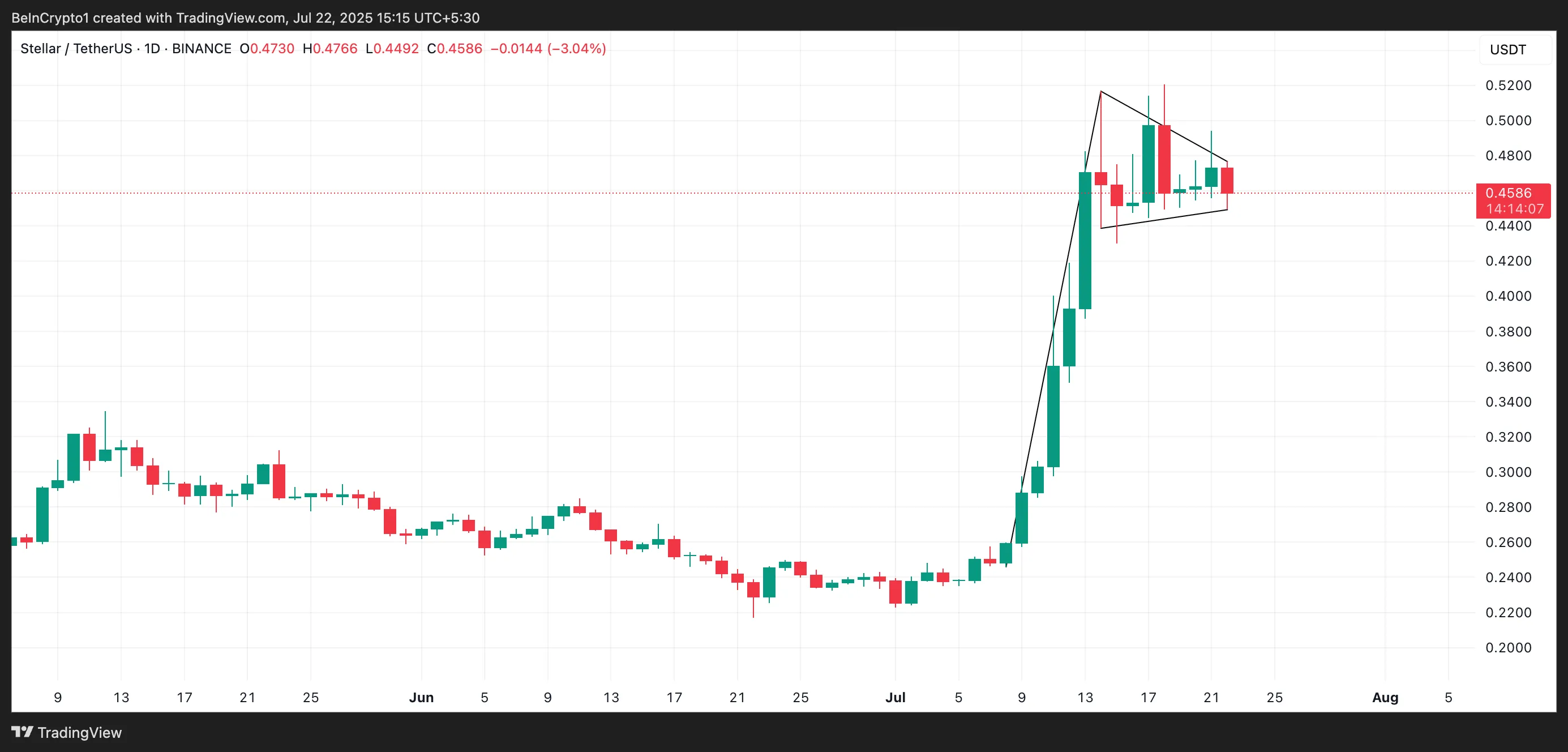 在日线图上,XLM已形成看涨三角旗形态。这种形态通常出现在强劲上涨行情(旗杆)之后,伴随形成类似小型对称三角形的盘整区间(三角旗)。