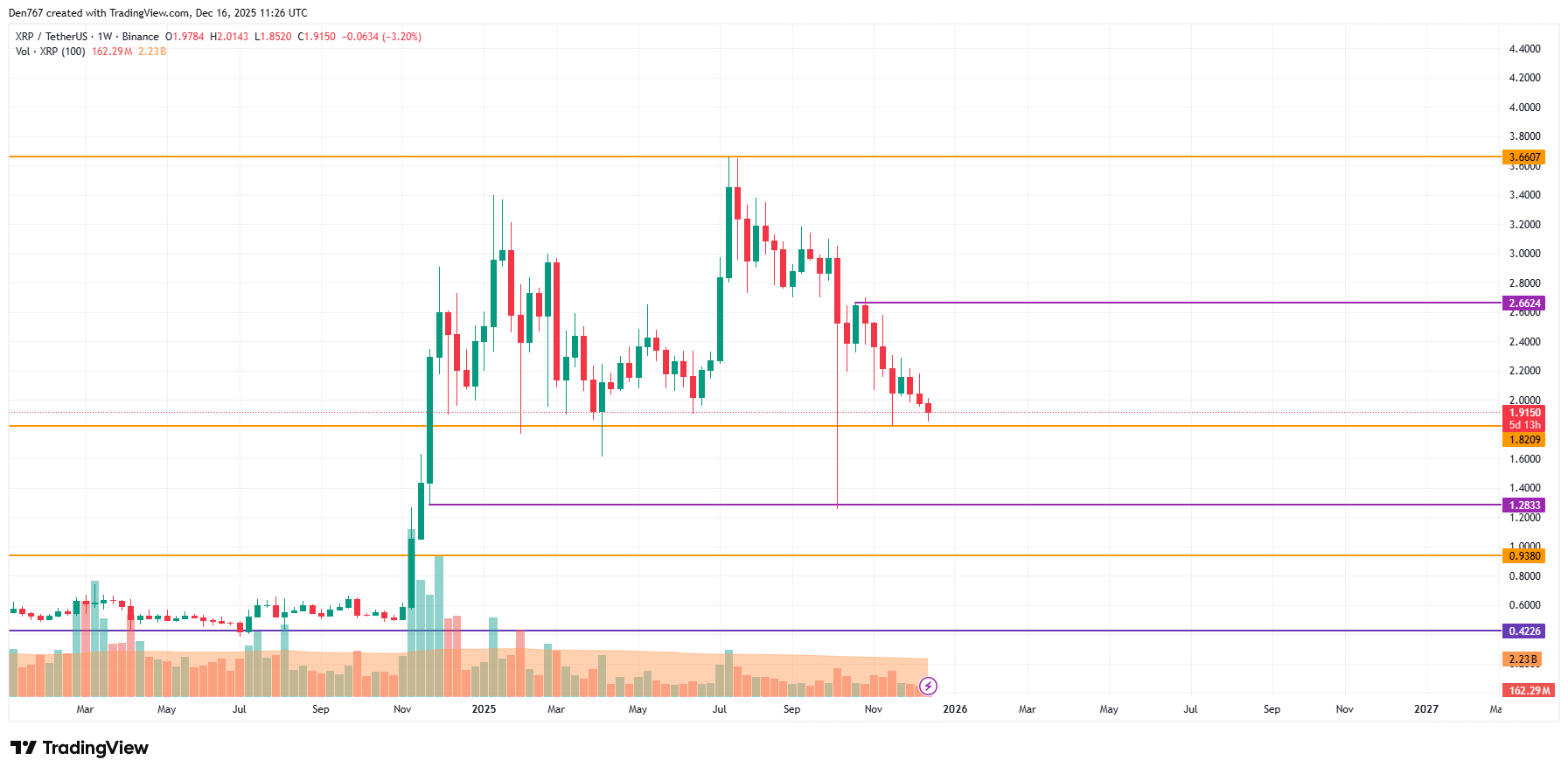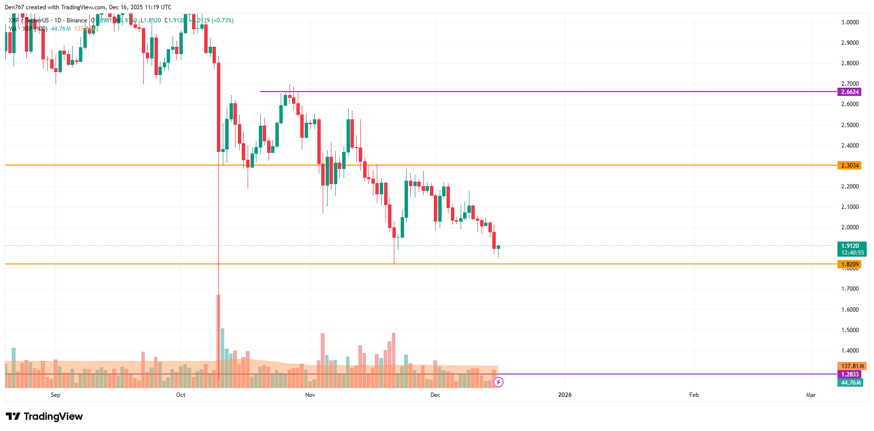 由于XRP价格仍在1.8209美元支撑位附近徘徊,尚未出现反转信号。若未能及时反弹,交易者需警惕价格继续下探至1.80美元区间。该走势预期在本周内持续有效。