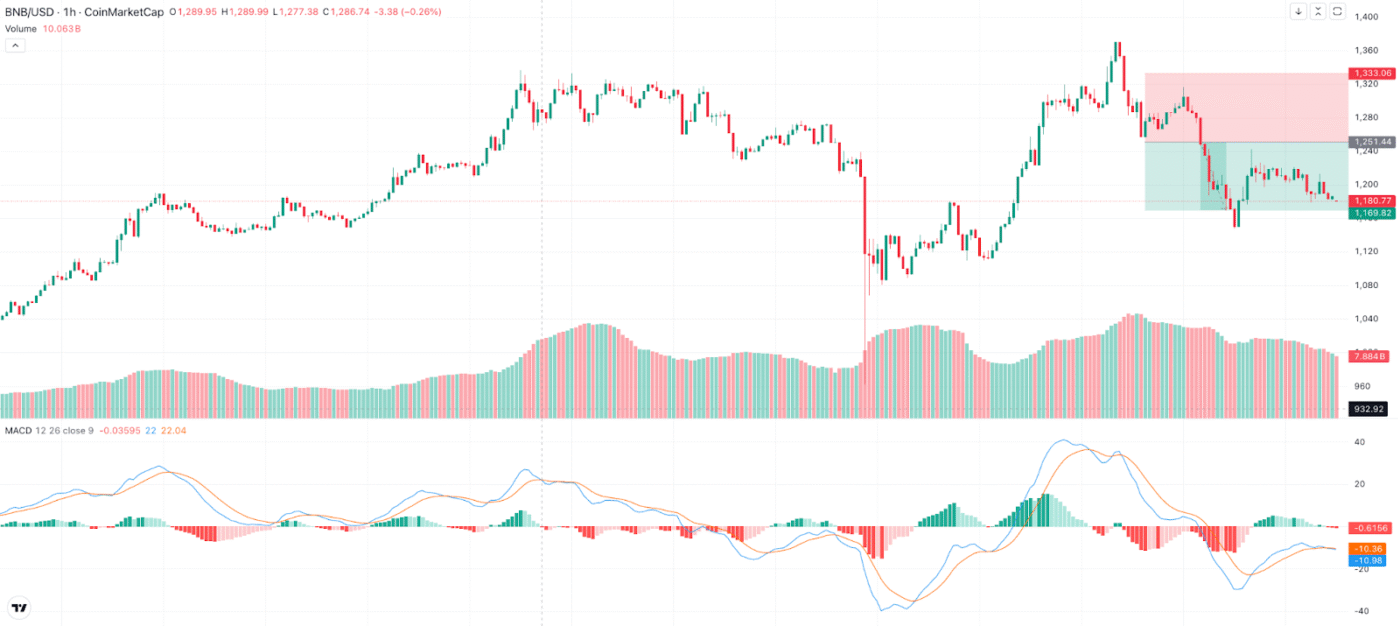 BNB当前徘徊于1,180美元附近,从近期1,333美元高点回落后呈现企稳迹象。MACD指标释放看跌信号:信号线跌破零轴,柱状图显示多头动能衰竭。交易量同步萎缩表明买盘薄弱,1,169美元的短期支撑位岌岌可危。若无法突破1,250-1,280美元阻力区间,可能面临进一步下跌。