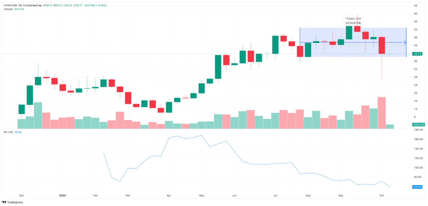 HYPE同样表现疲软,在跌破维持三个月的44-54美元交易区间后现报39.72美元。大额抛压导致支撑位实质性破位,反映市场不确定性加剧。尽管波动率仍处高位,但相较第二季度上涨行情动能明显减弱。若不能收复44-46美元关键区域,短期内或将维持区间震荡或继续下探。