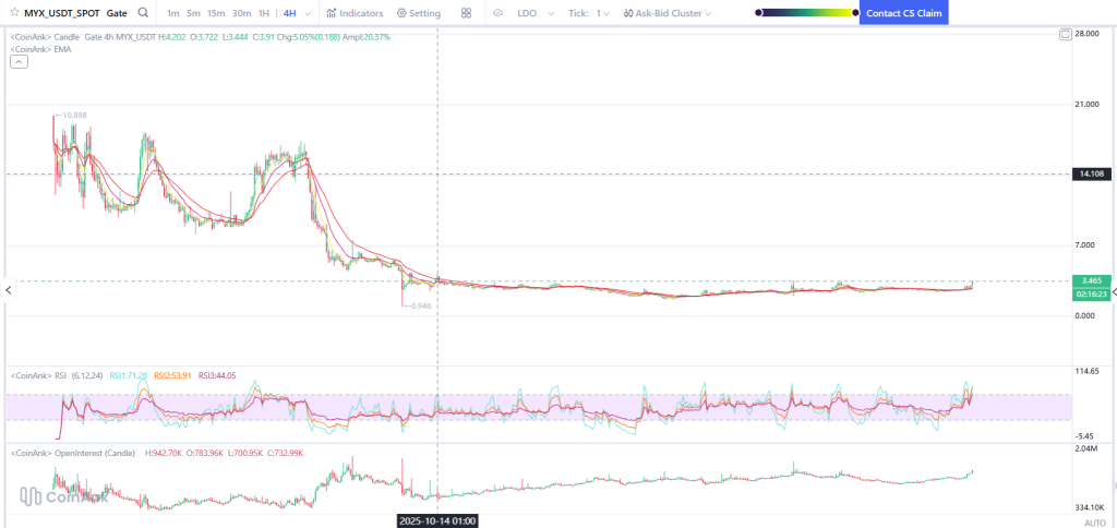 图表显示价格已突破短期均线系统,这些均线此前一直处于走平状态。MYX价格在触及4.20美元后小幅回落,但整体结构已呈现数月未见的健康态势。3.05美元区域仍是关键阻力位,若MYX能携动能有效突破该位置,新一轮上涨行情或将启动。