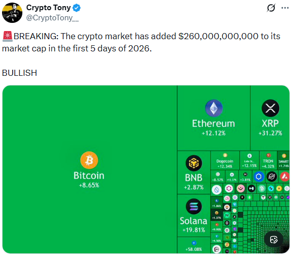 尽管2025年数字资产表现平平,但在新年伊始,加密货币市场已显现积极态势。主要加密货币如比特币、以太坊和XRP均实现可观涨幅,为投资者带来信心。当前市场回暖得益于有利的经济环境、全球发展动态以及整体向好的市场情绪。