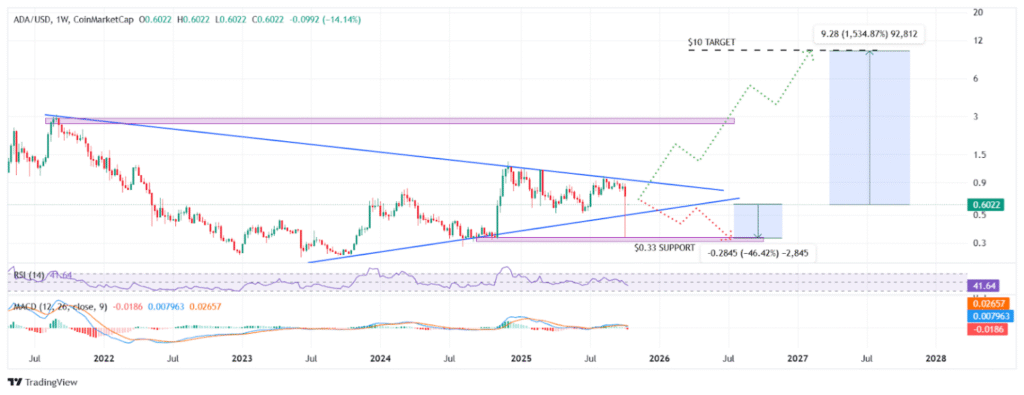 ADA持续构筑长达数年的对称三角形技术形态,随着价格接近模式顶点,市场正等待方向性突破。若确认突破下降阻力线,可能引发向10美元目标的反弹(较当前价潜在涨幅达1500%)。反之若失守上升支撑线,则可能下探0.33美元支撑位(潜在跌幅46%)。目前RSI指标41.64显示中性偏弱动能,MACD柱状图反映看涨力量减弱并出现死叉。