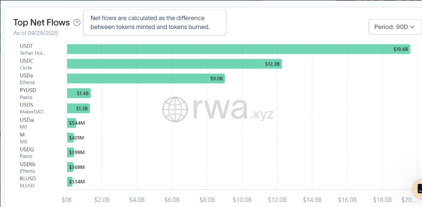 第三季度数据显示,USDT和USDC分别录得196亿和123亿美元的资金流入,而Ethena的USDe同期吸引约90亿美元资金,凸显出市场正朝着多元化方向发展。