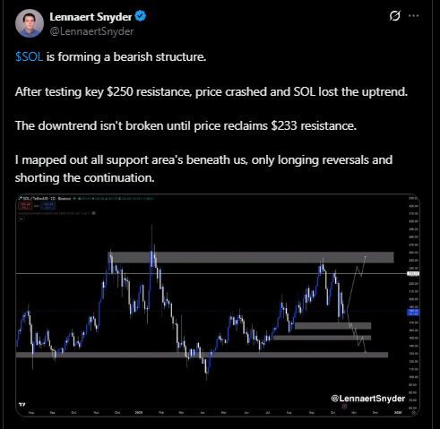 Solana价格在未能延续前期涨势后,交易于190美元附近。分析师LennAert Snyder指出,当价格在250美元区域遇阻后,该代币已失去看涨趋势并形成更低的结构框架。他补充说明,233美元水平成为区分下跌延续与重启上涨潜力的关键阻力位。这一技术结构表明,代币可能继续在180美元附近的支撑位与233美元阻力位之间震荡。
