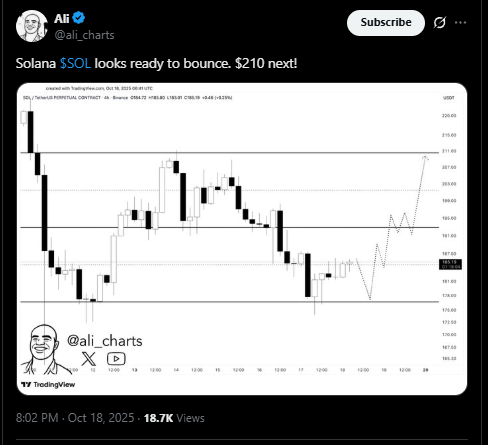 另一位市场观察者Ali提出不同见解。其四小时图表显示190美元附近出现价格压缩形态,该模式通常预示短期反弹。他将210美元列为下一关键观察位,认为Solana可能上攻至该点位后遭遇更强阻力。Ali的分析暗示技术性整固(而非新的市场催化剂)可能推动温和复苏阶段。但他警告称,除非动能显著改善,否则230-237美元区间的广泛阻力带可能限制涨幅。