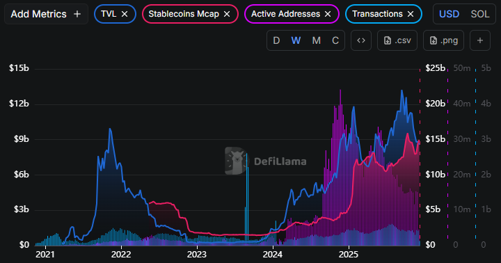 尽管SOL价格回调,但其基本面依然稳固。DefiLlama周度数据显示,Solana锁仓总价值(TVL)维持在85.6亿美元,虽较132.2亿美元的历史高点有所回落,但在当前市场环境下仍属强劲。与此同时,Solana稳定币市值达149.6亿美元,仅略低于150.8亿美元的历史峰值,表明稳定币信心持续稳固,链上流动性仍在增长。