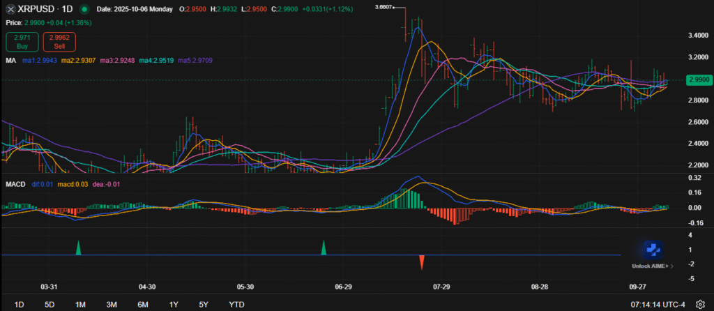 经历2025年初的波动后,XRP现交投于2.99美元附近,动能逐步增强。该代币显现企稳迹象,短期阻力位附近买盘活跃。移动平均线确认价格进入再平衡阶段,关键技术支持位持续有效。