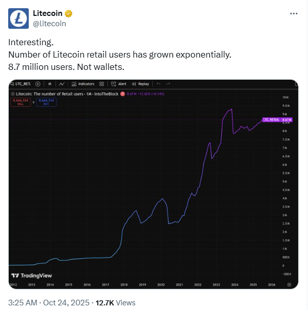 根据最新社交媒体披露,持有莱特币的零售用户数量呈指数级增长。值得注意的是,870万用户正在积极将其用于支付、转账或持有等日常用途,而非被动投资。莱特币网络特别强调,这870万用户均为活跃消费者,而非简单钱包统计。