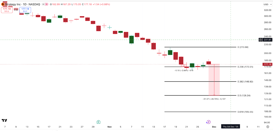 股价必须守住172美元关口,否则若比特币持续疲软,MicroStrategy可能跌向146美元甚至126美元。