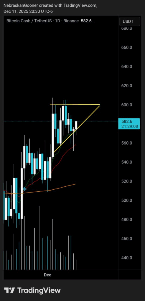BCH维持在清晰的上升三角形结构内运行,价格始终高于吸引持续买盘的上升支撑线。该形态通过每次下边界测试的规律性反应逐步形成。市场在582美元区域附近交易,同时遵循多时段形成的连续更高低点。这些价位显示出积极防御态势,K线影线持续在上升斜线附近形成,表明回调期间存在稳定承接而非弱势表现。