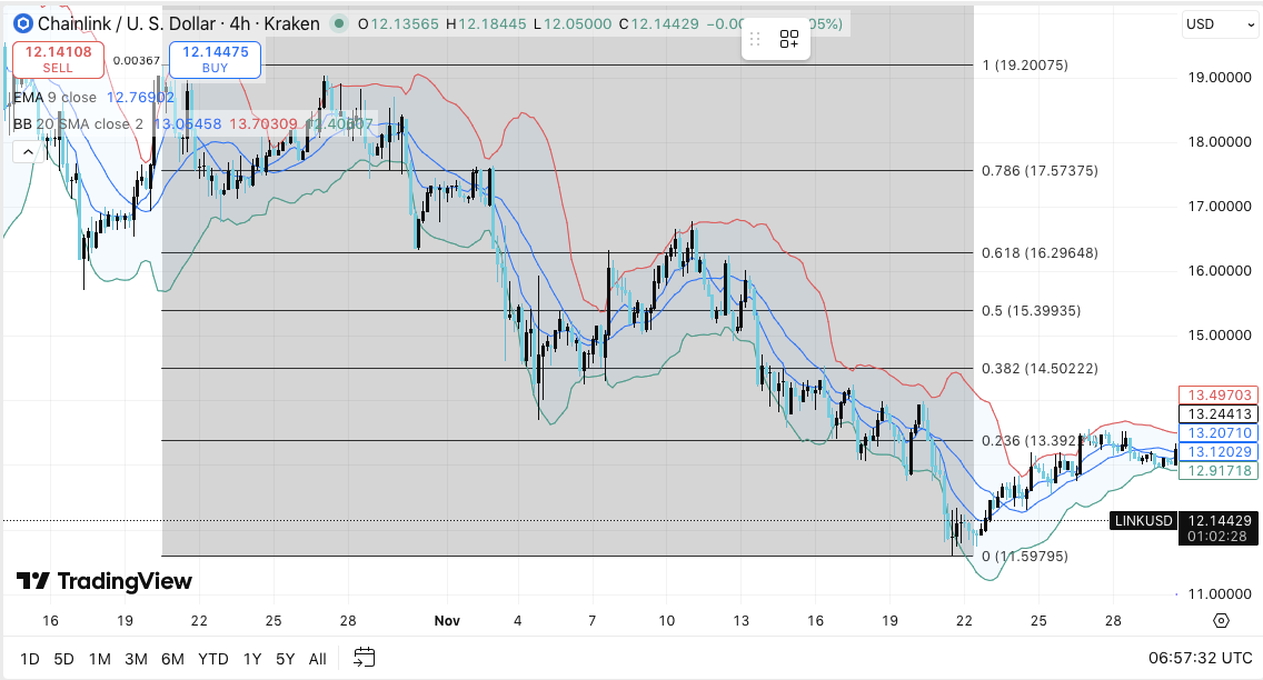 Chainlink现报12.14美元附近,初现价格企稳信号。近期K线形成更高低点,表明短期情绪略有改善,但整体趋势仍偏向看跌。