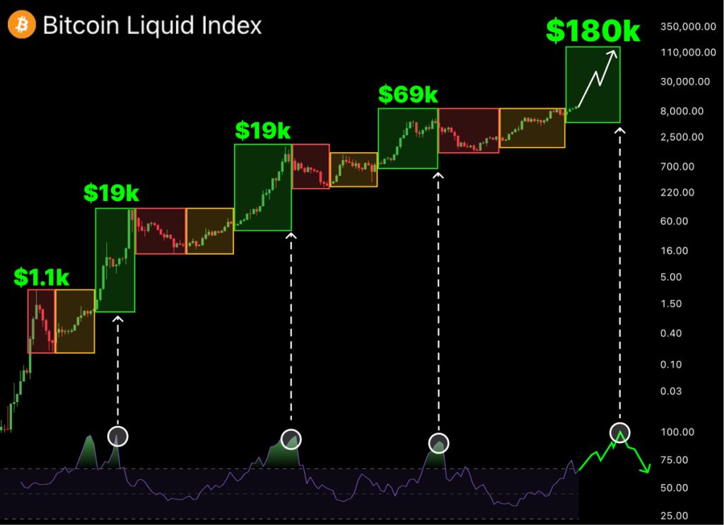该指标的历史回溯令人瞩目——每个周期顶点均精准对应均线交叉时刻。当前均线分离程度表明比特币可能继续攀升,部分市场参与者预测目标位或将触及18万美元。