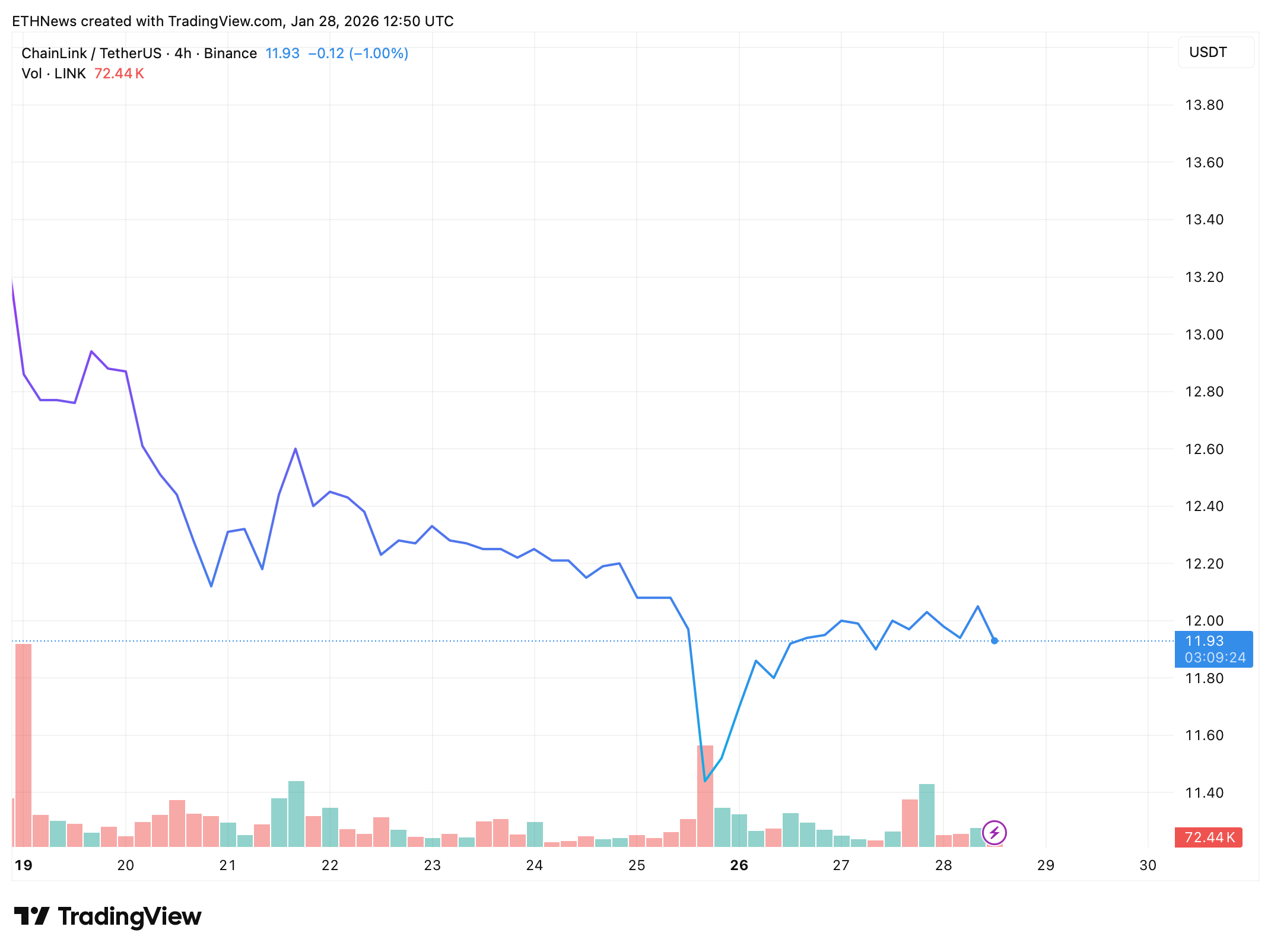 截至1月28日,LINK交易价格约为11.9美元。本周早前出现的剧烈清算打破了先前的整理区间,虽价格已从局部低点企稳,但整体结构依然脆弱,LINK难以收复失守的关键支撑。
