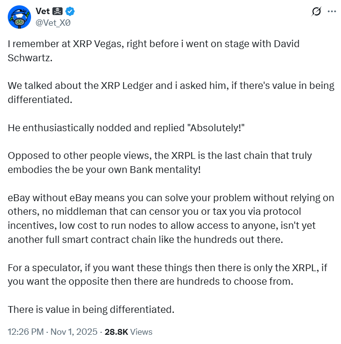 用户Vet分享与瑞波CTO David Schwartz的对话,强调XRP账本的核心价值在于其简洁性、高效性与去中心化特性。他认为保持账本的独立特质才是区别于其他链的关键。