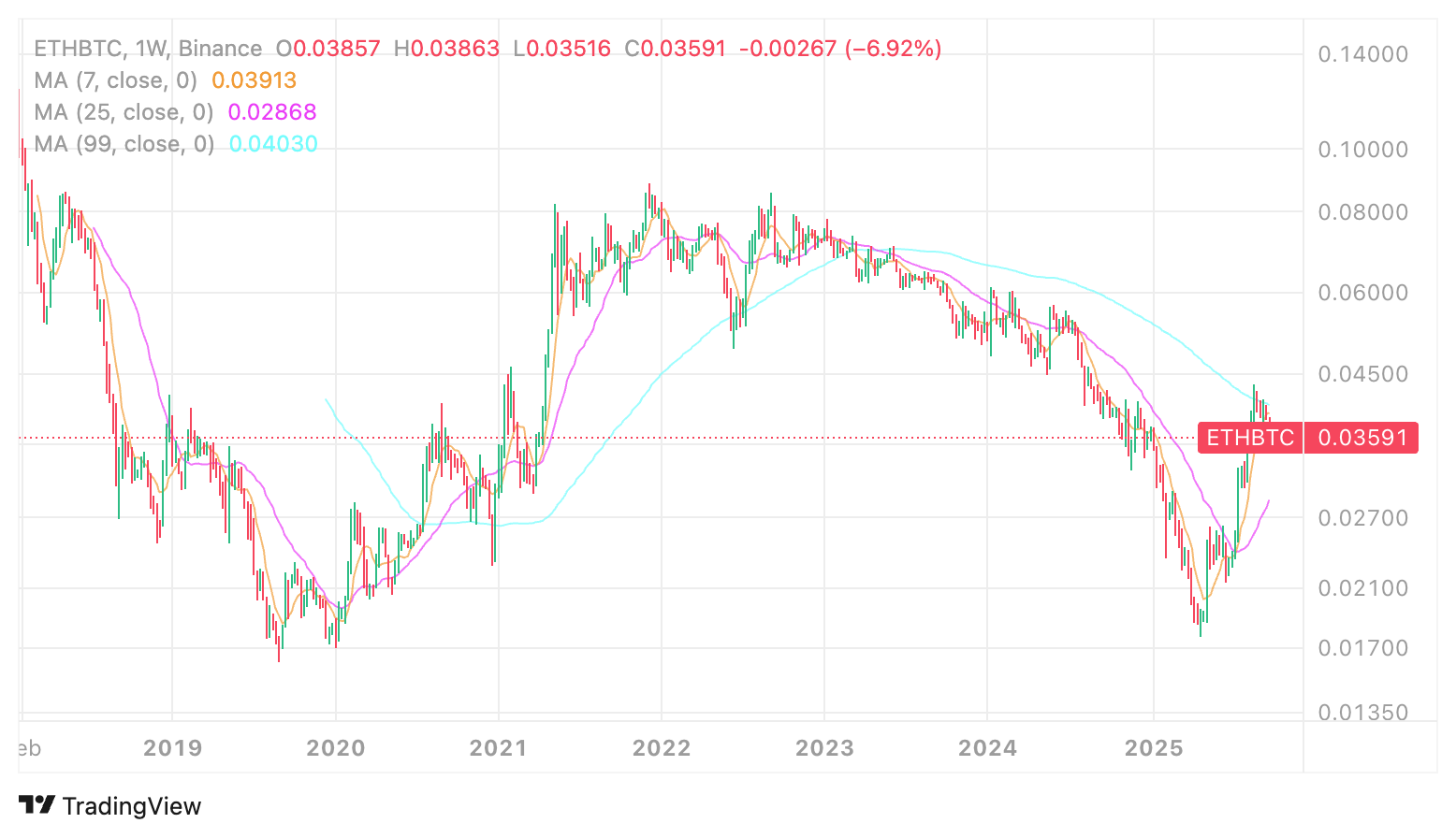 从技术图表观察,ETH长期在1000-4800美元区间震荡。2025年9月虽短暂触及4800美元却未能突破,当前RSI指标进入超卖区域,ETH/BTC汇率处于下降通道。市场叙事疲劳叠加基本面疲软,3800-3500美元成为关键支撑位,一旦失守可能下探2800美元。