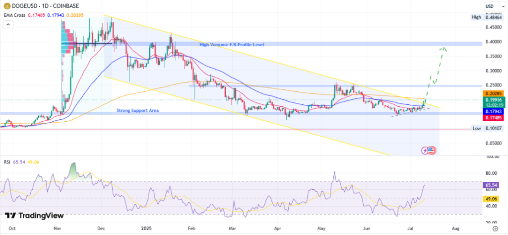 2025年初以来,狗狗币日线图呈现明显的下降通道形态。该代币曾多次测试0.15美元附近的低位支撑,本周终于决定性突破下降楔形上轨。目前狗狗币交易价格接近0.198美元,市值达300.3亿美元。价格已站上20日和50日EMA均线形成关键看涨信号,并逐步逼近长期200日EMA均线带。