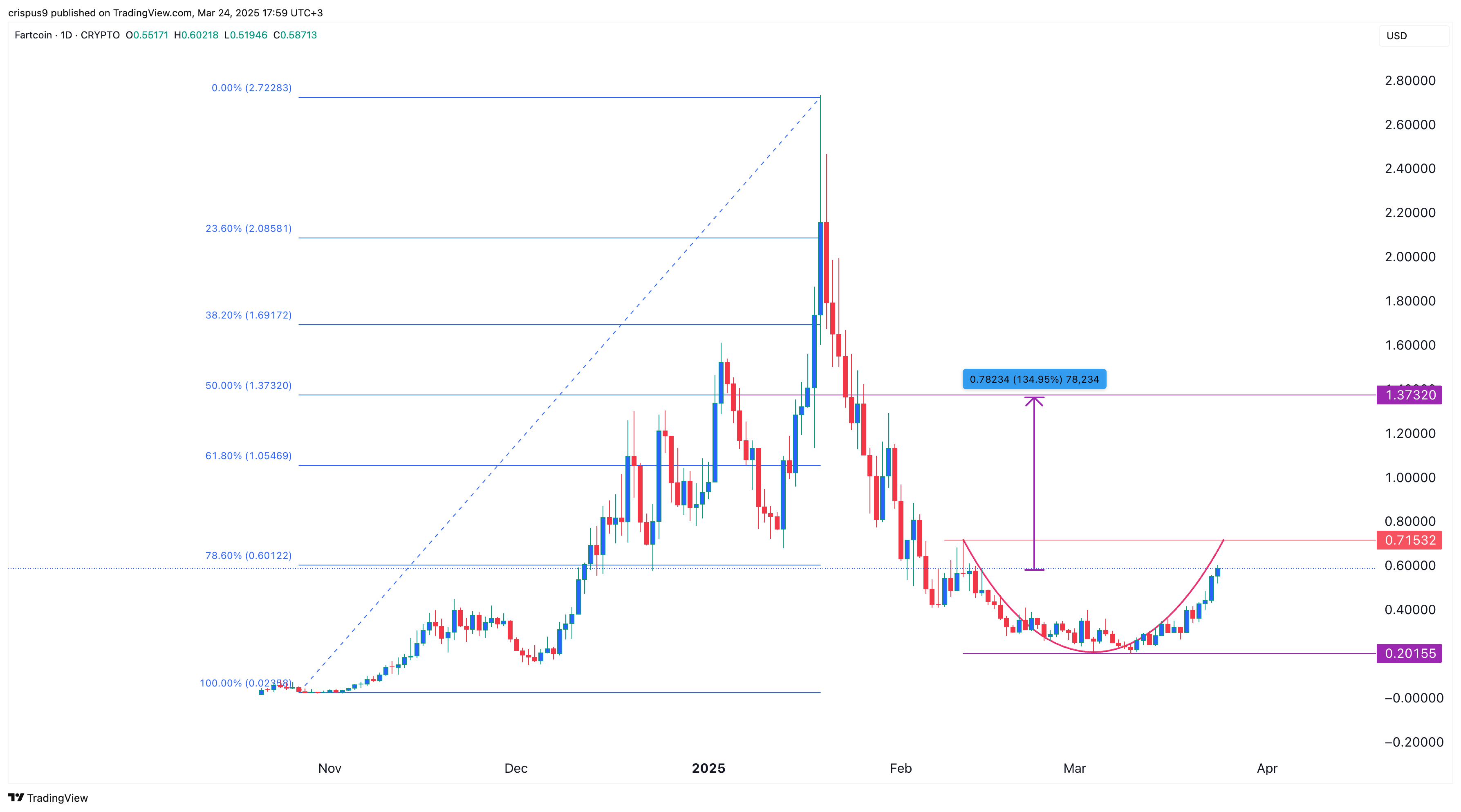 日线图显示,Fartcoin本月在0.2015美元触底,随后缓慢回升至目前的0.60美元,徘徊在2月以来的最高水平。