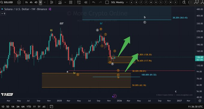 根据一则推文,在Solana价格图表上,整个下跌仍可被解读为A–B–C修正模式。在此结构中,当前的上涨类似于内部第4浪反弹,可能存在再一次下行。这种情况预示着,在出现任何持久的反转或基于需求的价格走势之前,价格可能严峻地跌向81–90美元区域。