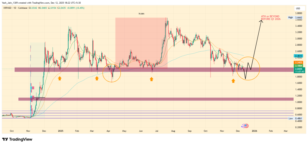 暂且抛开SOL的美元价格视角,替代币领域似乎正在发生变化,表明市场正趋于成熟。作为蓝筹替代币,XRP继续在2美元心理关口附近的紧密整合区间内运行,该区间在2025年第四季度的暴跌中展现了韧性,且其更广泛的基本面正在加强。这表明XRP很有可能出现大幅上涨。