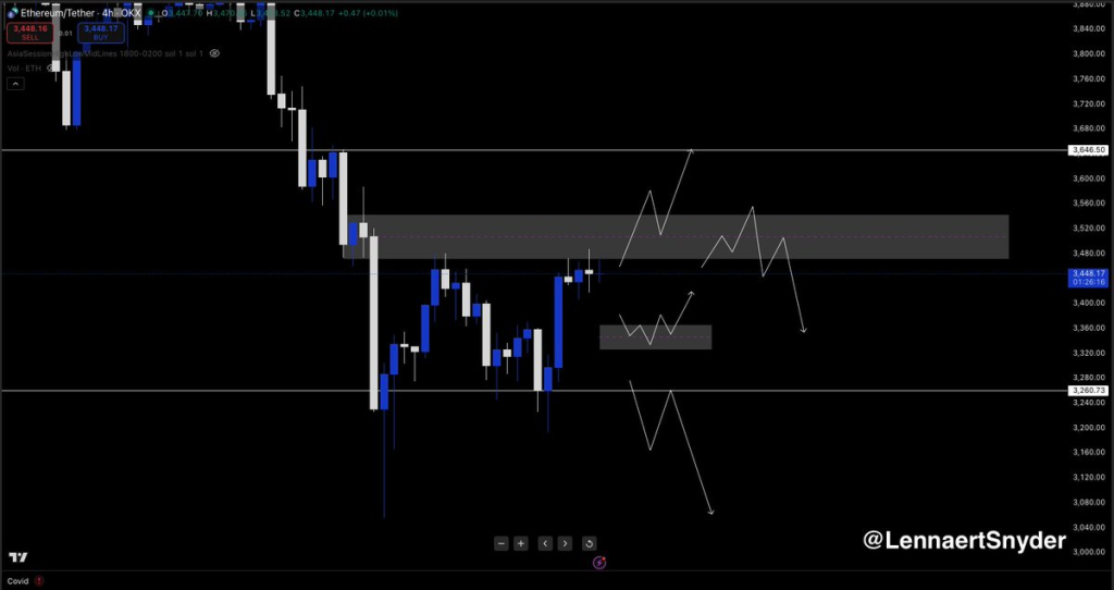 分析师LennaertSnyder分享的图表显示,ETH正在3480-3550美元关键阻力区上沿盘整。该区域曾多次成为转折点,市场正等待方向选择。若有效突破并站稳,下一目标位看向3646美元;若遇阻回落,可能下探3350美元或更低。