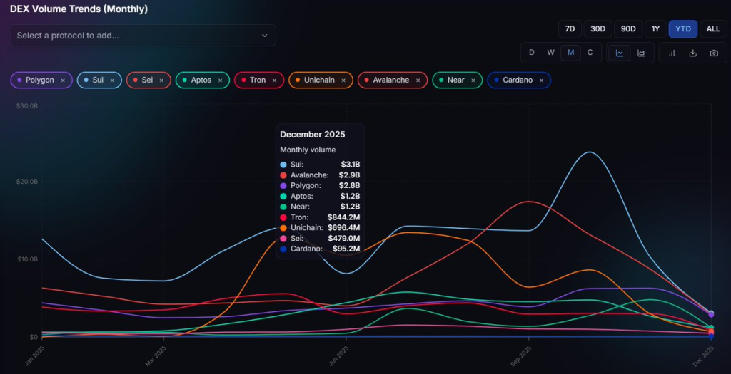 Sui 在 12 月完成了约 31 亿美元的去中心化交易所交易量。相比之下,Cardano 同期的记录约为 9500 万美元。这一差距并非微不足道。整个月内,Sui 处理的链上交易量是 Cardano 的 30 多倍。