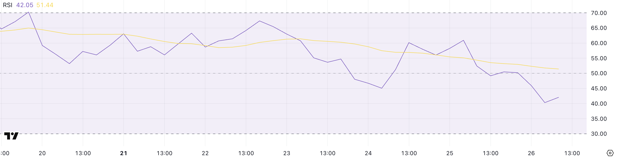 Hyperliquid的相对强弱指数(RSI)正在急剧冷却,从昨天的60.93降至42。这一突然下降表明最近的看涨势头已经减弱。在本周早些时候进入超买区域后,HYPE正接近中性至轻微超卖的水平。