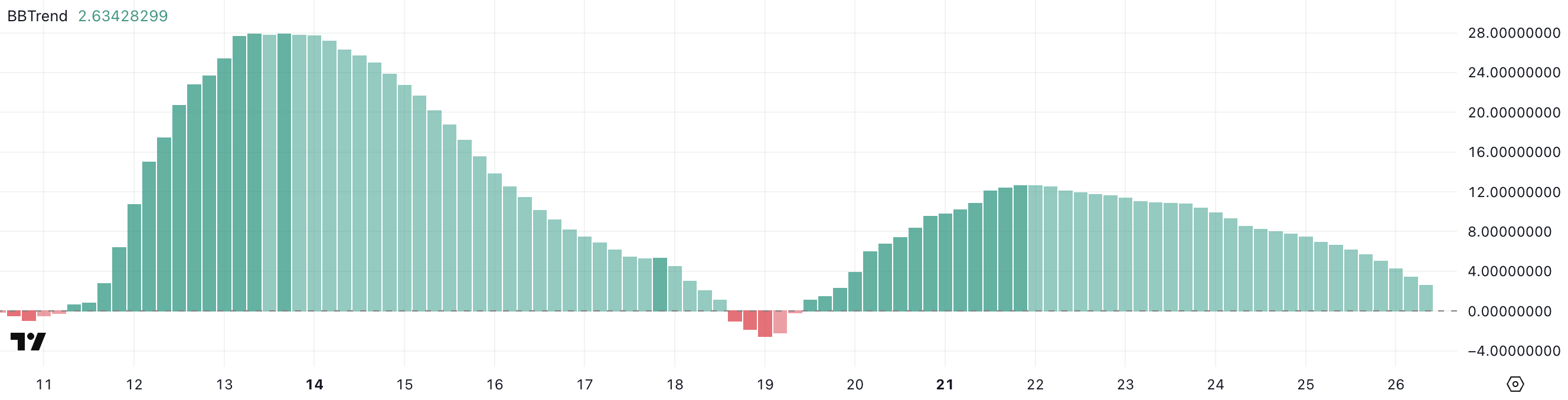 在BBTrend指标中,目前为2.63,比五天前的12.68有所下降。这一急剧下降表明,早先的看涨势头已经迅速消退。BBTrend读数如此急剧下降通常反映趋势强度的大幅放缓,表明价格可能进入盘整阶段或准备进行更深的修正。