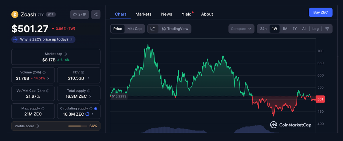 经历较大幅度回调后,ZEC价格在500美元附近获得支撑。这款隐私币在连续下跌数日后出现反弹,门罗币价格紧随其后进入盘整阶段。今年以来,这两种代币表现均优于大盘,尤其是ZCash价格过去几个月涨幅超过1000%。