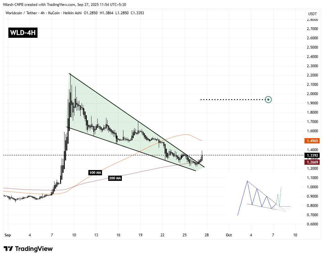 该楔形形态始于9月9日2.21美元附近的峰值,价格持续下探过程中多次获得趋势线底部支撑。近期WLD从1.22美元强势反弹,突破1.26美元附近的楔形阻力趋势线(该位置恰与200日均线重合)。目前突破已推动价格逼近1.38美元的局部高点,进一步强化看涨预期。