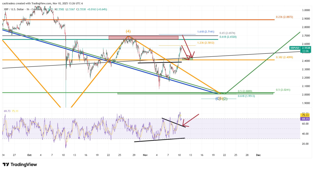 图表显示明确结构:XRP价格在触及2.58美元附近的阻力区后遭遇抛压,图表上的陡峭向下箭头预示价格可能回落至支撑线。主要橙色趋势结构仍指向调整形态,对角线突破尚未形成有效延续。