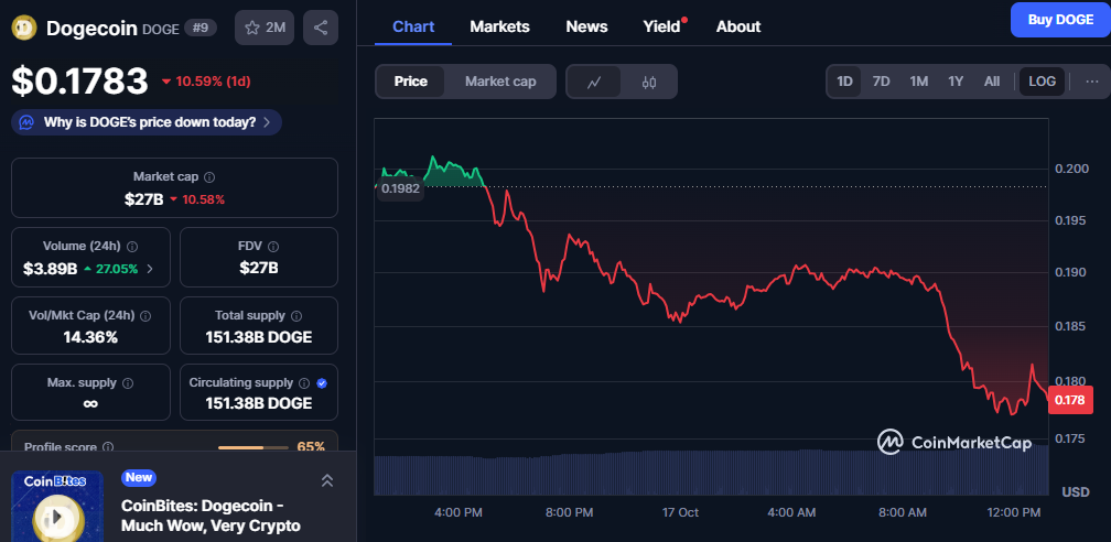 狗狗币(DOGE)暴跌10.5%至0.178美元——交易量激增27%显示空头占据主导