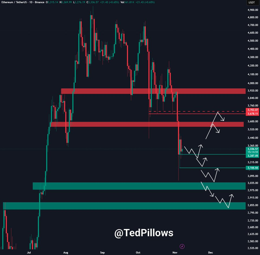 Ted评论道:"需求已经下降,价格很难维持。"若该支撑区失守,ETH可能跌向多个图表标记的更低位置。当前底部失守后,3035美元、2975美元和2855美元附近被视作潜在支撑位。