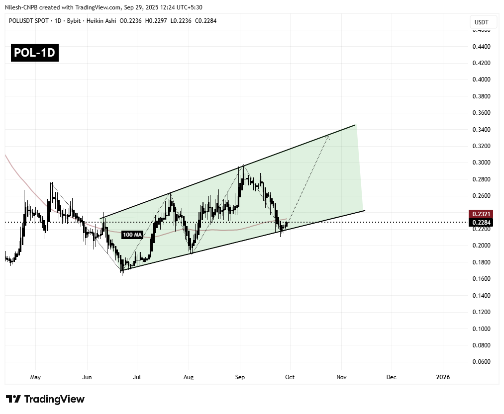 本周该代币测试楔形底部0.21美元支撑位后出现小幅反弹。截至发稿,POL交投于0.2284美元附近,略低于100日均线(0.2321美元)这一关键阻力位。