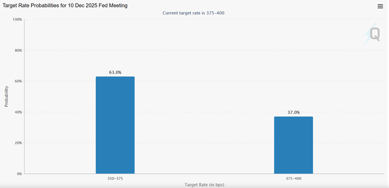定于12月10日举行的下次FOMC会议数据显示,降息350-375基点的概率已降至63%,375-400基点的概率约为37%。