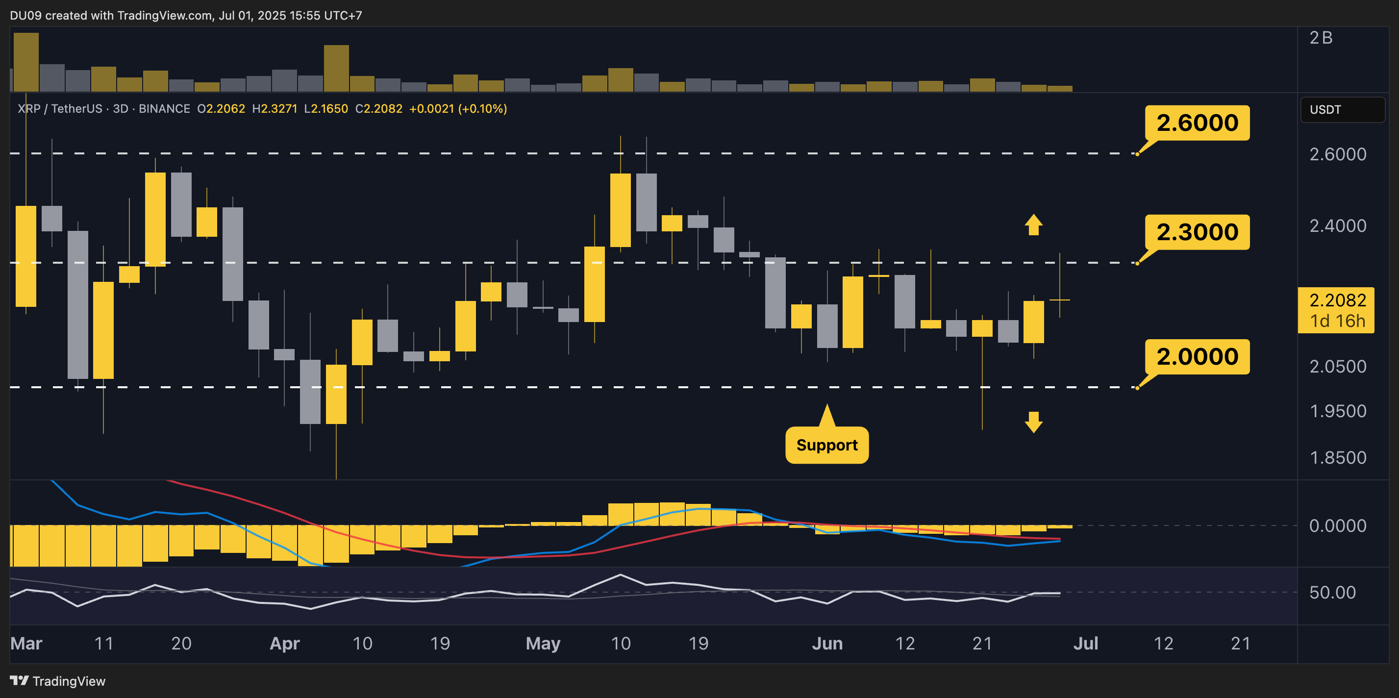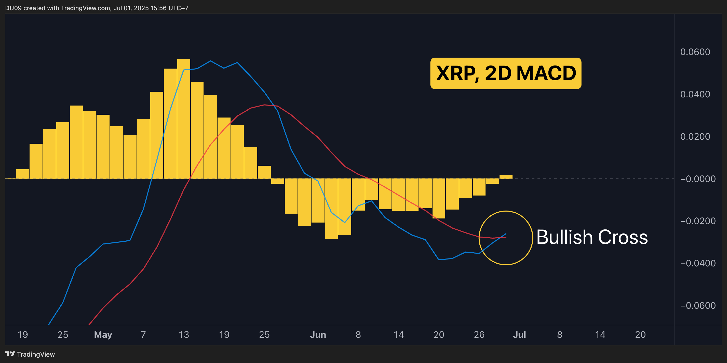 继上周日线MACD转正后,两日线MACD今日亦转入看涨区域。这表明买入动能正逐步向更长时间框架渗透,这将增强投资者对价格走势的信心并吸引更多买盘。在正向反馈循环作用下,XRP七月有望冲击2.6美元甚至更高价位。