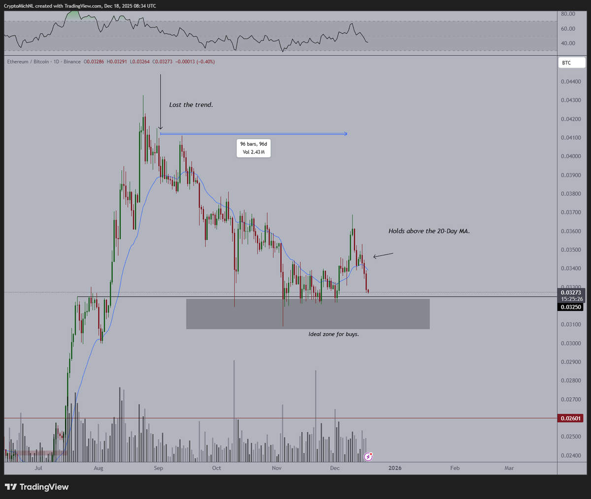 尽管出现下跌,ETH/BTC仍处于宏观支撑区域附近。Van de Poppe认为未来48小时至关重要,若该区域能引发动量转换,或将预示山寨币重现强势;反之若无法企稳,则会强化市场的谨慎态势。